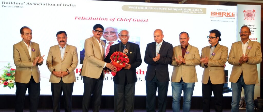 बिल्डर्स असोसिएशन ऑफ इंडिया (बीएआय) पुणे सेंटरतर्फे आयोजित आणि बी. जी. शिर्के कन्स्ट्रक्शन टेक्नॉलॉजी प्रायव्हेट लिमिटेड प्रायोजित २९ व्या ‘बीएआय-शिर्के वेल बिल्ट स्ट्रक्चर कॉम्पिटिशन २०२५’ या पुरस्कार वितरण सोहळ्यात डॉ. राजेंद्र डहाळे बोलत होते. हॉटेल शेरेटॉन ग्रँडमध्ये झालेल्या कार्यक्रमावेळी ऑल इंडिया ‘बीएआय’चे माजी अध्यक्ष आर. राधाकृष्णन, बी. जी. शिर्के कंपनीचे आर. बी. सूर्यवंशी, ‘बीएआय’ महाराष्ट्राचे अध्यक्ष जगन्नाथ जाधव, बीएआय पुणे सेंटरचे अध्यक्ष अजय गुजर, ‘डब्ल्यूबीएससी’चे अध्यक्ष सुनील मते, उपाध्यक्ष महेश मायदेव व सचिव राजाराम हजारे, सचिव सी. एच. रतलानी, खजिनदार महेश राठी आदी उपस्थित होते.