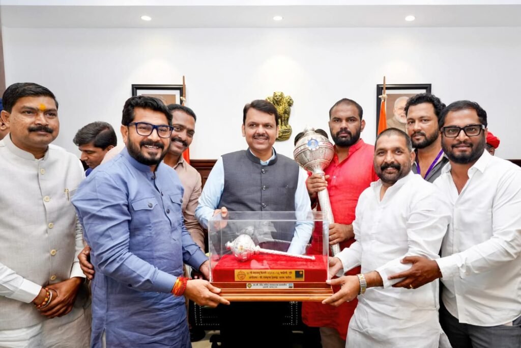 मुंबई :* महाराष्ट्र राज्याचे मुख्यमंत्री मा. श्री. देवेंद्रजी फडणवीस साहेब यांची ६८ वा महाराष्ट्र केसरी विजेता हर्षवर्धन सदगीर यांच्यासह स्पर्धेचे आयोजक रामकृष्ण सातव यांनी भेट घेतली. माननीय मुख्यमंत्री महोदयांनी हर्षवर्धन सदगीर यांच्या कामगिरीचे तसेच स्पर्धेच्या यशस्वी आयोजनाबद्दल महाराष्ट्र राज्य कुस्तीगीर संघ व आयोजकांचे कौतुक केले. यावेळी महाराष्ट्र राज्य कुस्तीगीर संघाचे कार्याध्यक्ष मा. पै. संदीप भोंडवे, पुणे जिल्हा कुस्तीगीर संघाचे अध्यक्ष मा. मेघराज कटके, केतन जाधव उपस्थित होते.
