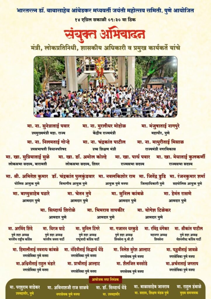 पुणे : भारतरत्न डॉ. बाबासाहेब आंबेडकर यांच्या जयंतीनिमित्त ‘भारतरत्न डॉ. बाबासाहेब आंबेडकर मध्यवर्ती जयंती महोत्सव समिती, पुणे’ यांच्या वतीने मंगळवार, १४ एप्रिल रोजी सकाळी ९.३० वाजता भव्य ‘संयुक्त अभिवादन’ सोहळ्याचे आयोजन करण्यात आले आहे.